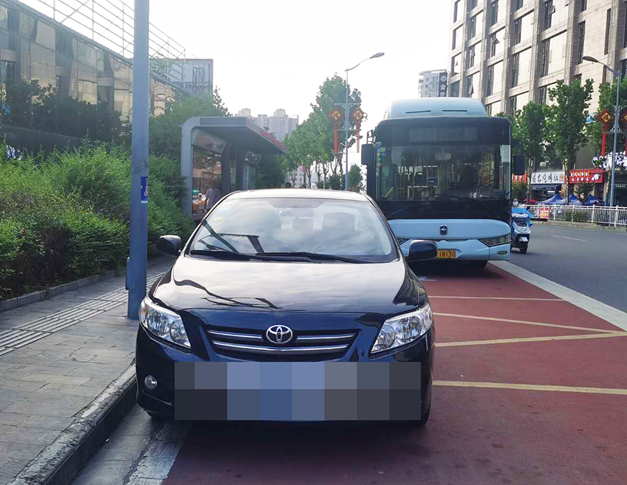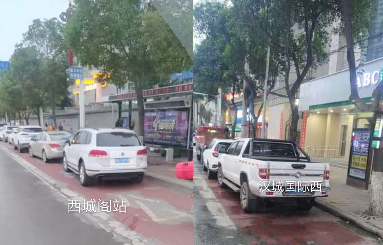在金州廣場南站,十幾輛私家車“整齊劃一”的停在公交車站位置,地面紅色區(qū)域上的公交兩字也被完全覆蓋,從遠處望去,站牌旁坐著幾個人正等待公交車的到來。在興華名城站,一輛私家車??吭诠卉囌厩?,駛來的公交車無法按其規(guī)定進站停車。在西城閣站和漢城國際西站,幾輛私家車甚是“任性”,儼然將公交車站當成了“停車場”,筆者在此駐足十幾分鐘,它們依然“紋絲不動”,有的車上甚至沒有車主。
